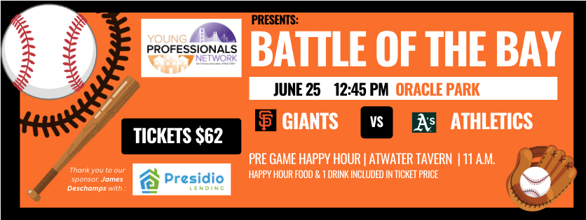 Come join SFAR YPN at Battle of the Bay – San Francisco Giants vs the A’s! Please join us before the game at 11 a.m. for happy hour at Atwater Tavern near the ballpark with food and drinks hosted by SFAR YPN.