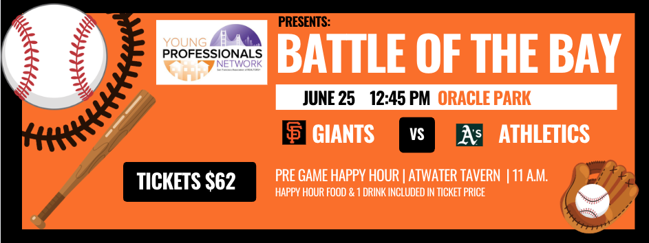 Come join SFAR YPN at Battle of the Bay – San Francisco Giants vs the A’s! Please join us before the game at 11 a.m. for happy hour at Atwater Tavern near the ballpark with food and drinks hosted by SFAR YPN.